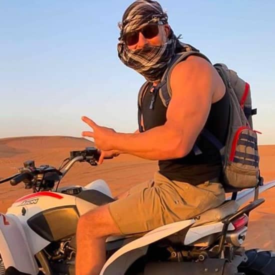 Tickets 1-Hour Quad Bike Ride for 1 Highlights ️ Ride the Dubai desert sand on a quad bike Beginners welcomes – instruction on how to safely drive is provided ️ Zoom through the dunes and race with your friends on an adventure mode General Info Date and time: various dates and times (select when making your purchase) ⏳ Duration: 1 hour Location: Dubai Desert Zoom Age requirement: 18+ with valid ID ♿ Accessibility: this experience is not wheelchair accessible Please note: not suitable for pregnant people or anyone with back problems, heart problems or other serious medical conditions ❓ For this event, all sales are final and tickets can’t be refunded, changed or modified. For more information, please refer to our T&Cs Description Riding an ATV in the desert is a dream to many but getting to do so on your own is quite the undertaking. Bypass the hassle of using your own equipment and book this Dubai Desert Quad Bike Ride. This experience lets you ride an ATV and provides the quad bike as well as the equipment. You’ll zoom over sand dunes and race other riders on an adventure you won’t soon forget! 1 Hour Ride with Quad Bike 700 Raptor at Secret Location 1 Hour Ride with Quad Bike, Dubai, United Arab Emirates