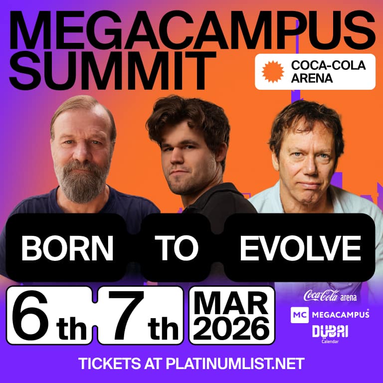 – On March 6-7, 2026, the Coca-Cola Arena in Dubai will host Megacampus Summit, the world’s largest lecture event, officially recognised by Guinness World Records. The Summit is built around progress and continuous evolution, bringing together forward-thinking entrepreneurs, Nobel laureates, bestselling authors, and leading figures from sports and the creative industries to explore the ideas and innovations that drive growth. The 2026 edition will feature an outstanding lineup of speakers, including: Magnus Carlsen – The greatest chess player of all time; Robert Greene – Bestselling author of The 48 Laws of Power and renowned strategist; Wim Hof – World-record holder known as The Iceman and pioneer of the Wim Hof Method. And this is only the beginning – more world-renowned speakers will be announced soon. In 2026, the Summit will bring together 13,000 international leaders, innovators, entrepreneurs, investors, and creators for two transformative days of ideas, networking, and collaboration in the heart of Dubai. Megacampus Summit 2026 – Born to evolve. Mega Campus Summit 2026 at Coca-Cola Arena, Dubai, United Arab Emirates events Conferences Coca-Cola Arena Magnus Carlsen