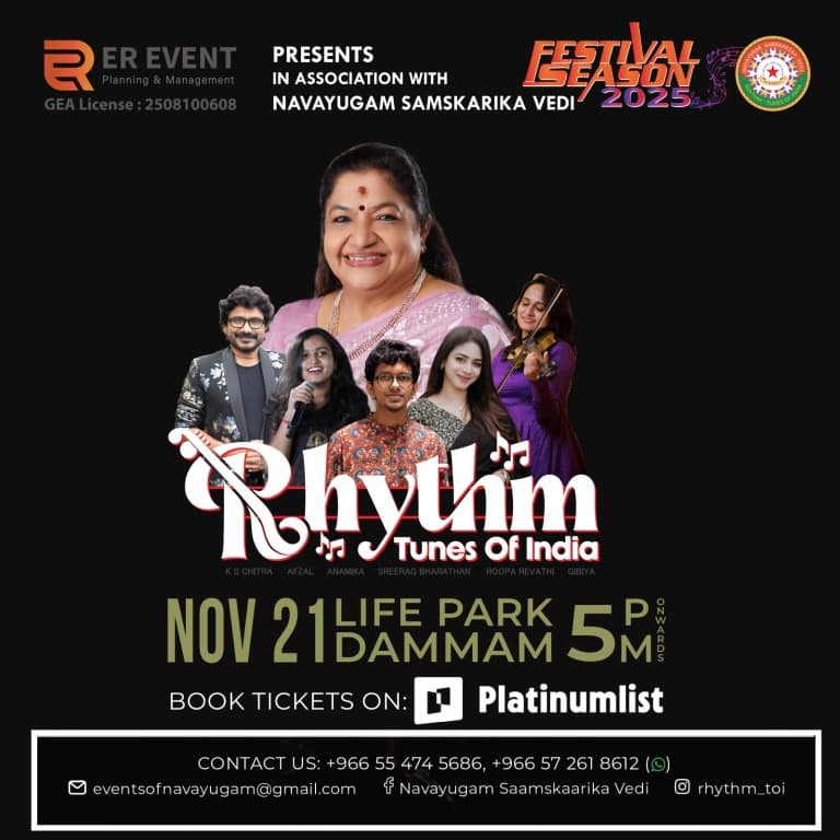 . India’s legendary singer Padma Bhushan K. S. Chitra will be performing live in Dammam for the very first time, joined by an exceptional lineup of artists including Mohamed Afzal, Sreerag, Anamika, and Roopa Revathy. This much-anticipated event promises an unforgettable evening filled with timeless melodies and captivating performances that celebrate the richness of Indian music. Rhythm Tunes Of India in Dammam at Life Park events Concerts Life Park in Dammam K.S. Chithra