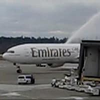 The first Emirates flight arrives at SeaTac Airport.wmv